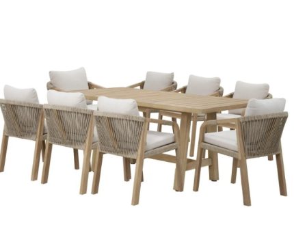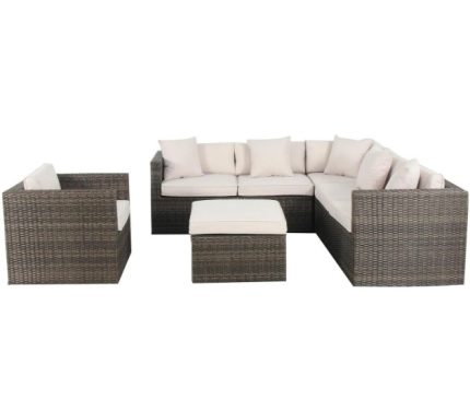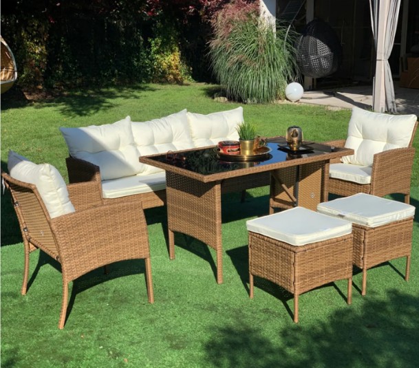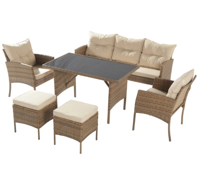 Este conjunto de comedor está diseñado para acomodar a siete personas cómodamente, ideal para reuniones familiares o con amigos en tu terraza o jardín. Su estructura de PE ofrece durabilidad y resistencia a las inclemencias del tiempo, mientras que los cojines de poliéster brindan un soporte suave y cómodo para largas conversaciones y cenas al aire libre. La mesa, con su superficie de vidrio templado, añade un toque de elegancia y es fácil de limpiar, asegurando que siempre luzca impecable.