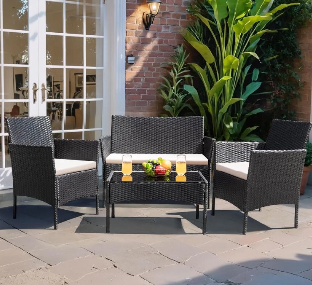 Diseño simple y suave combinado con ratán negro y cojines beige, aporta un sentido clásico y moderno a estos muebles de jardín. La útil mesa de centro de vidrio templado es adecuada para colocar bebidas, alimentos y frutas, disfrutando de la hora del té con sus familiares y amigos.