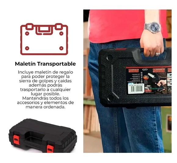 Maletín de Transporte: Viene en un estuche rígido de color negro y rojo, facilitando el almacenamiento y transporte seguro de la herramienta y sus accesorios.