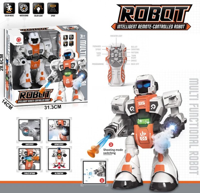 Diviértete con este robot a control remoto que ilumina y suena mientras giras y disparas sus dardos. Con un tamaño compacto de 24 cm de alto, 11 cm de fondo y 17 cm de ancho, es ideal para niños mayores de 3 años que aman la acción y la tecnología. Perfecto para juegos llenos de movimiento y adrenalina, este robot será el compañero ideal para aventuras emocionantes.