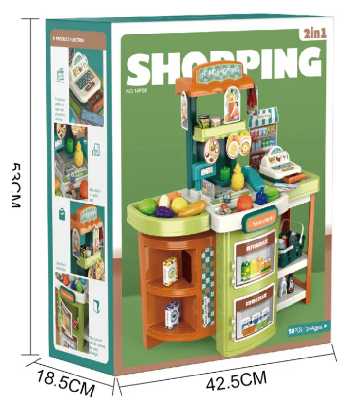 La caja de carrito de almacenamiento multifuncional 2 en 1 es el juguete perfecto para simular un emocionante viaje de compras al supermercado en casa. Con su diseño innovador, este juego de juguete de supermercado ofrece horas de diversión y entretenimiento para los más pequeños.