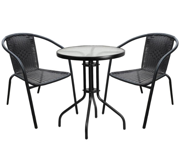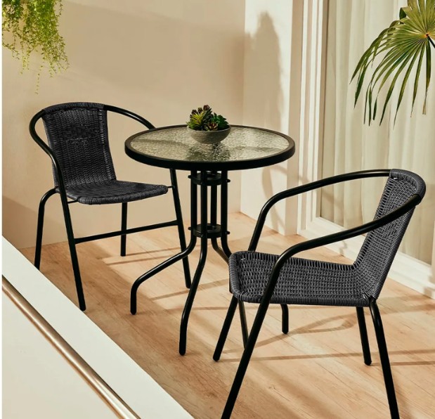 El Set de terraza en color negro te ofrece la combinación perfecta entre estilo contemporáneo y durabilidad. Compuesto por 2 sillas con estructura de metal y una mesa de vidrio con estructura de metal, este conjunto es ideal para darle un toque moderno a cualquier balcón, terraza o patio. La mesa de vidrio de 70×60 cm no solo es elegante, sino que también está diseñada para resistir las condiciones exteriores.