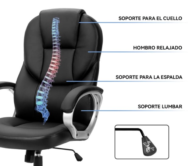 Con un respaldo alto aerodinámico que se adapta a la curva natural de la columna vertebral humana, junto con un amplio cojín de asiento y reposabrazos acolchados, esta silla de oficina ejecutiva brinda soporte y comodidad óptimos para su cuerpo. Dile adiós a las molestias de espalda y columna durante las largas jornadas de trabajo, ya que esta silla ayuda a aliviar el dolor y reducir el estrés sedentario y la fatiga.